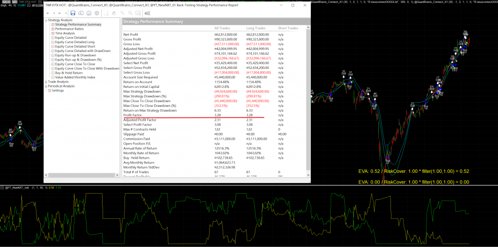 所以現在多了兩顆腦,一顆上腦一顆下腦。掛上後,我們就可以看到在該回溯周期的分析結果已經出現在圖表上頭,上排數值為這個策略的多單屬性品質,下排為這個策略的空單屬性品質。